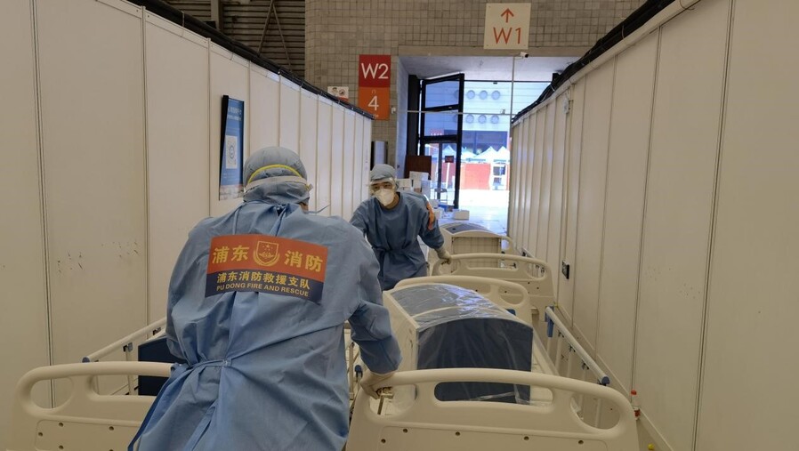 志愿者在上海新國際博覽中心方艙醫院里忙碌