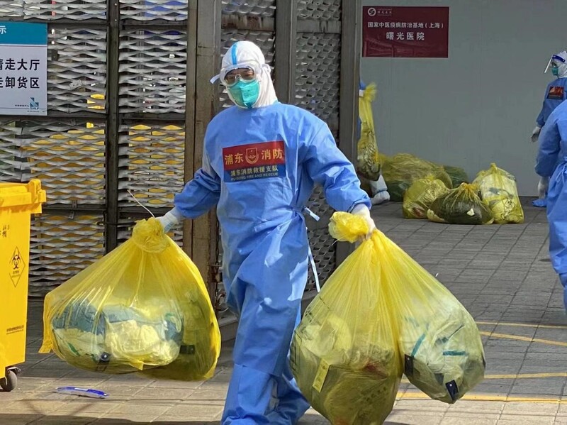 4月10日,新國博方艙醫院面臨保潔人員緊缺,堆積的醫廢垃圾急需轉運,排除消防隱患,陸家嘴消防大隊大隊長李和清向仁濟醫院新國博方艙醫院副院長陳尉華主動提出請戰,將N1艙與N2艙以及卸貨區的醫廢垃圾集中轉運至戶外臨時堆放點!爱敃r消防員真是幫我們解決了大問題!”陳尉華說。