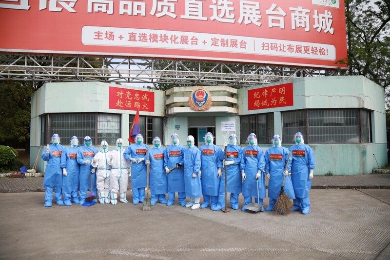 4月19日,根據上級指示,新國博方艙醫院W1與W2艙需改造為方艙內定點醫院。為加快落實“四應四盡”的步伐,盡快收治患者,陳尉華再次想到了堅實的戰友——消防隊的“藍精靈”。大隊長李和清立即派出11名消防隊員在院感的指導下,對兩個場館近3萬平方米進行消殺。24小時后,順利完成病區改造。4月21日中午,隊員們還沒吃飯,又趕往病區進行床位布置。