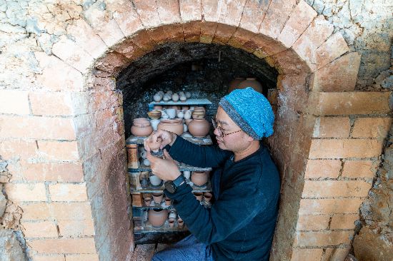 非遺傳承人婁林峰將手工作品擺入柴窯。孫凜攝