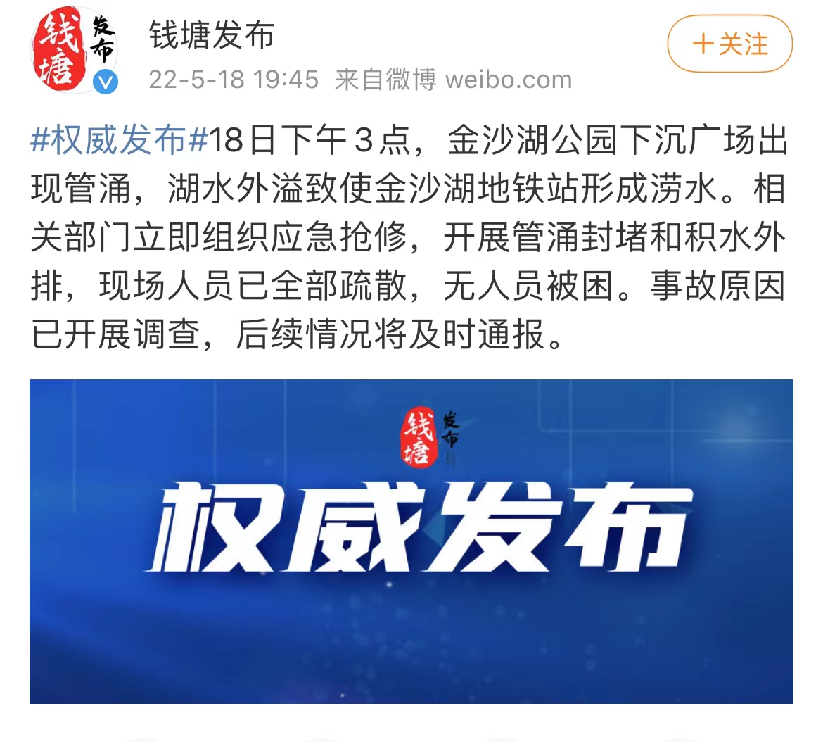 據錢塘發布消息,5月18日下午3點,杭州錢塘區金沙湖公園下沉廣場出現管涌,湖水外溢導致杭州地鐵1號線金沙湖地鐵站形成澇水。相關部門立即組織應急搶修,開展管涌封堵和積水外排,現場人員已全部疏散,無人員被困。