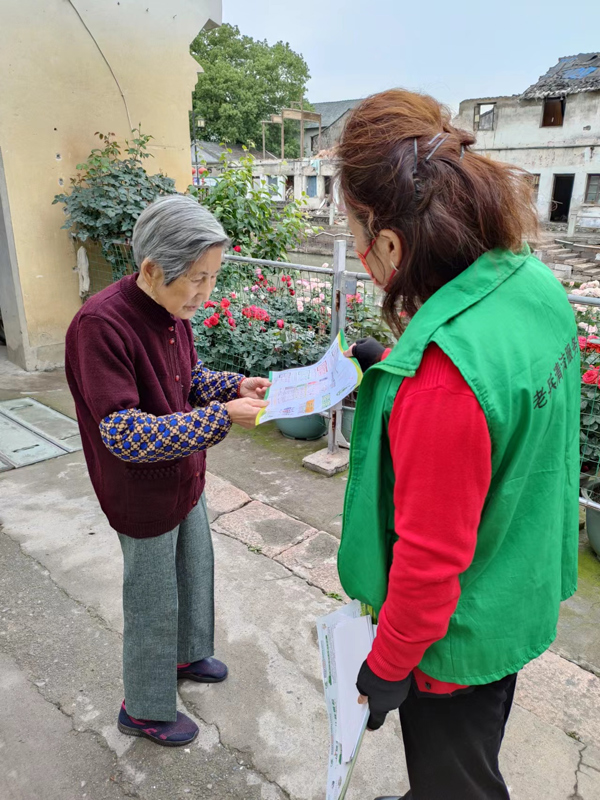志愿者上門向居民宣講垃圾分類知識。雙林鎮供圖