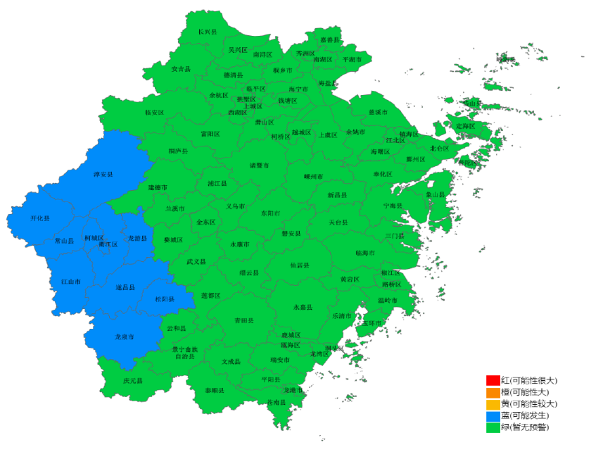 繼5月29日早上發出山洪災害黃色預警,5月29日17時25分,浙江省水利廳、省氣象局又聯合發布山洪災害藍色預警:預計5月29日20時至5月30日20時,杭州淳安縣、衢州柯城區、衢州衢江區、衢州常山縣、衢州開化縣、衢州龍游縣、衢州江山市、麗水遂昌縣、麗水松陽縣、麗水龍泉市可能發生山洪災害(藍色預警)。