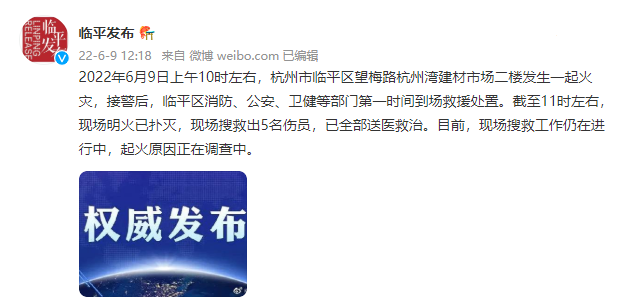 當天中午,臨平發布官方通報,2022年6月9日上午10時左右,杭州市臨平區望梅路杭州灣建材市場二樓發生一起火災,接警后,臨平區消防、公安、衛健等部門第一時間到場救援處置。截至11時左右,現場明火已撲滅,現場搜救出5名傷員,已全部送醫救治。目前,現場搜救工作仍在進行中,起火原因正在調查中。