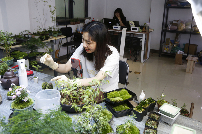 通過直播、短視頻等方式進行線上銷售是微景觀的主要銷售渠道。當地通過挑選50余名本地農戶,對其開展直播、短視頻等技能實效培訓,孵化具備現代營銷思維和技能的“新農人”,打造更多電商“直播間”。