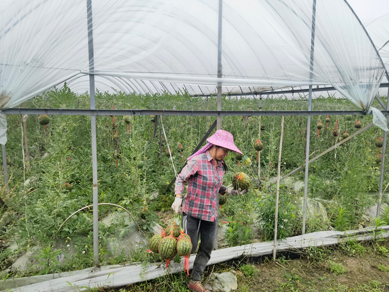陳道保是蓬街鎮蔬菜協會會員。1997年,他在寧波種瓜果蔬菜,2020年又來到蓬街,租種了40畝農田,用來種植葡萄、羊角蜜、水果玉米、番茄、西瓜等農產品。他種植的“空中西瓜”名叫特小鳳,之所以能種出高質量、好口感的“空中西瓜”,用陳道保妻子的話說,“一是有多年的種瓜經驗,二是平時他幾乎都呆在棚里,研究種植方法!罩形鞴稀墓庹諚l件均勻且充足,最后出來的口感是脆甜的!