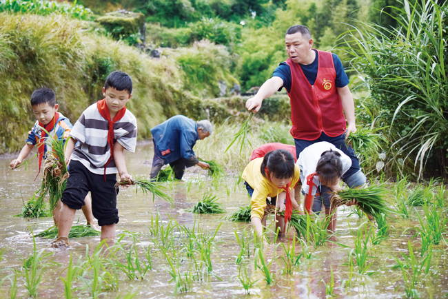 6月15日,金華武義縣新宅小學的孩子們來到大萊村梯田,在村民指導下學習插秧。當天,學校把勞動課搬進梯田,讓孩子們了解農時節氣、識別農作物品種,從小培養他們熱愛勞動和愛惜糧食的品質。(李云升)