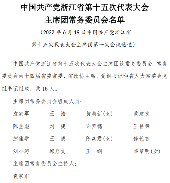 中國共產黨浙江省第十五次代表大會主席團常務委員會名單