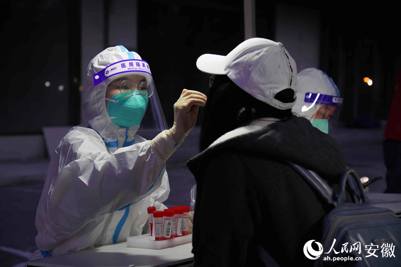 安徽省合肥市琥珀街道北苑村社區核酸檢測點,采樣人員正在進行核酸采樣。人民網 陳若天攝