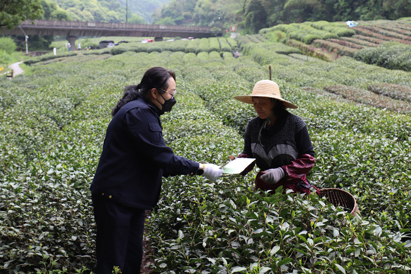 西湖風景名勝區錢江管理處工作人員向茶農發放山林生態保護宣傳冊。戴媛媛攝