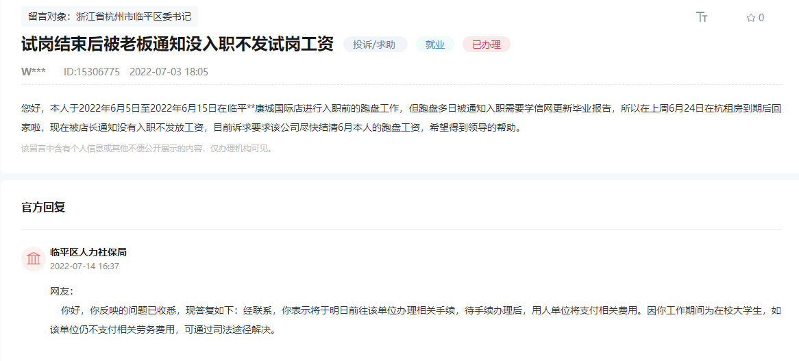 “試崗結束后被老板通知沒入職不發試崗工資?!?月3日,杭州一大學畢業生高女士在人民網“領導留言板”留言。