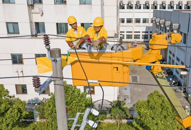 日前,在金華開發區秋濱街道涌雪街上,金華輸電運檢中心員工穿著絕緣服,戴著絕緣手套給小微企業用戶新接電線。1個多小時后,帶電作業完畢,員工衣衫被汗水濕透。(時寬兵)