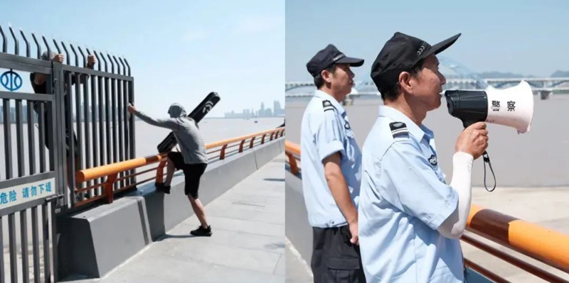 工作人員勸離釣魚群眾盡快上岸。杭州市林水局供圖