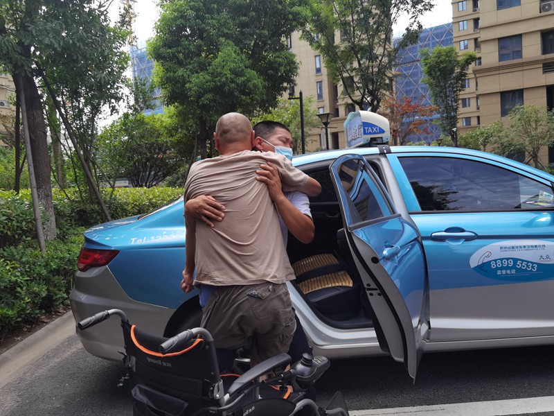 每次打不到車,孫月華都很無助。她一邊安慰自責的兒子,一邊按照警察給的叫車電話,叫來了一輛出租車。正當她吃力地想把偏癱的兒子抱上車時,出租車司機陳志飛急忙下車,主動幫她把兒子抱上座位,收拾好輪椅放進后備廂。