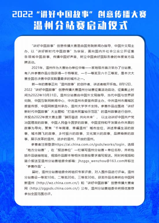 2022“講好中國故事”創意傳播大賽溫州分站賽8月12日起全面啟動作品征集,截止時間為2022年10月31日。溫州分站賽將圍繞“打造共同富裕示范區”主題征集溫州故事,聚焦“千年商港、幸福溫州”城市定位,講述幸福生活的故事、城市騰飛的故事、鄉村振興的故事、文化復興的故事、品牌煥新的故事,展示改革的溫州、進步的溫州、開放的溫州。