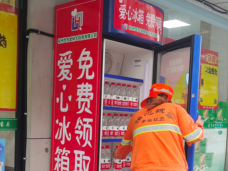 “高溫天氣能喝上一口冰水,真的太方便了!”近日,一臺醒目的紅色冰柜出現在杭州拱墅區武林街道一處藥店門口,冰柜上寫著“愛心冰箱,免費領取”等字樣,吸引了不少過路人駐足。