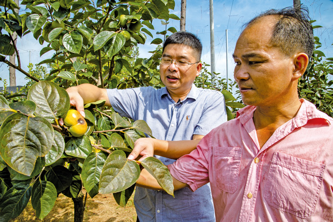 8月26日,金華開發區湯溪鎮黃堂村農田里,金華市農科院果樹專家沈建生現場指導太秋甜柿果樹受旱后的補救措施。由于持續高溫干旱,金華全市范圍不少作物受旱嚴重,影響正常生長。近期,金華市農科院組織若干個農業專家小分隊奔赴全市受旱嚴重的田間地頭,開展現場指導補救工作,減少經濟損失。(胡肖飛)