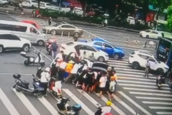8月28日上午,浙江永康市九鈴東路與麗州中路的交叉路口,一女子在騎車通過路口時,被右轉的車輛撞到并卷入車底。危急時刻,近30位路過的市民伸出援手,一起抬車將人救出。