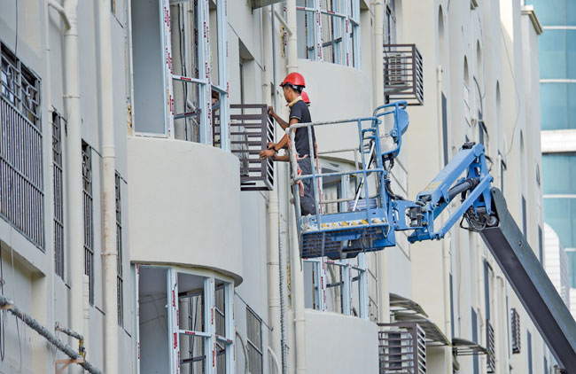 8月30日,施工人員在金華開發區三江街道江濱小區,對沿街居民樓的空調外機進行專項改造,加裝統一的“外衣”。此次改造,還解決了空調外機滴水、不規范安裝等問題。金華市政部門同時對沿街立面、人行道的破損,飛線等問題進行綜合整治。(李建林)