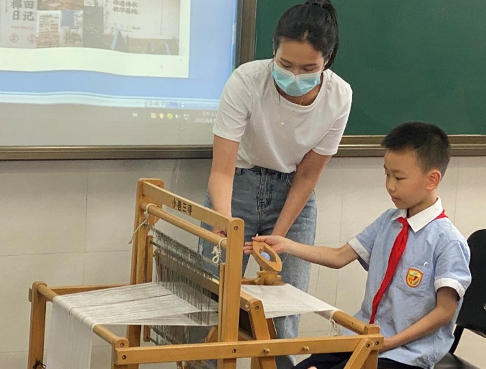在杭州西湖小學,老師教學生穿絲線。受訪者供圖