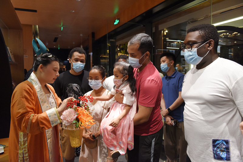來自馬達加斯加的Njava作為一名外教已經在樂清生活三年,當晚她帶著丈夫和女兒一同來到現場。3歲的女兒Kasia穿著漢服、頭上簪著一支步搖,跟著爸爸媽媽品茗、聽民樂、吃月餅,時不時發出開心的笑聲。Njava說,學校的老師提前向她介紹了中秋節的習俗,所以她也入鄉隨俗為女兒準備了服裝,帶著全家人一起參與這個溫馨、團圓的節日,現場濃濃的中秋氛圍讓他們充分感受到中華傳統文化的獨特魅力,也感受到樂清這個城市帶給他們的溫暖與熱情。