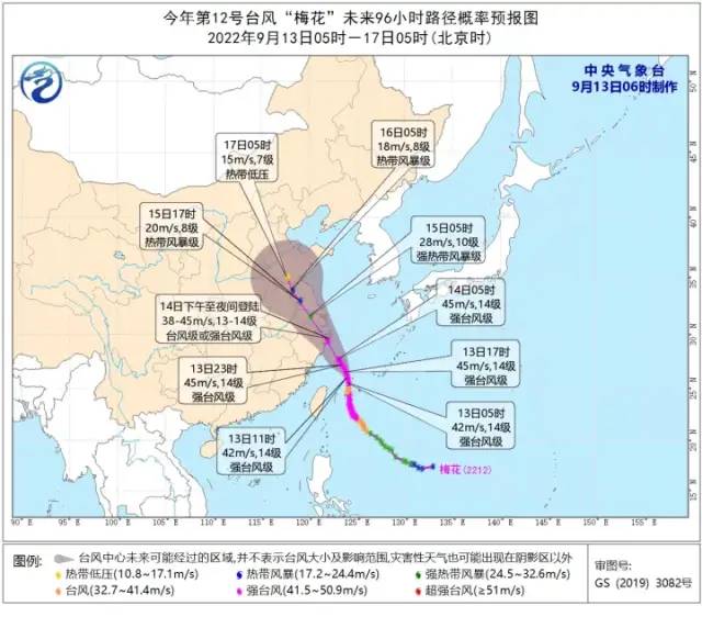 大風預報:9月13日08時至14日08時,巴士海峽、臺灣海峽北部、臺灣以東洋面、黃海西南部海域、東海大部及釣魚島附近海域、長江口區、杭州灣以及臺灣島北部和東部沿海、浙江沿海、福建北部沿海、上海沿海、江蘇東南部沿海將有6—8級大風,陣風9—11級,其中東海部分海域將有9—11級大風,陣風12—14級,“梅花”中心經過的附近海面的風力有12—14級,陣風可達15—16級。