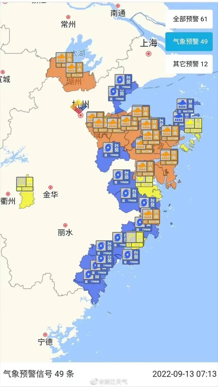 一大早,浙江暴雨、大風、地質災害、山洪災害等預警齊發,截至早晨7點13分,浙江省正在預警61條。