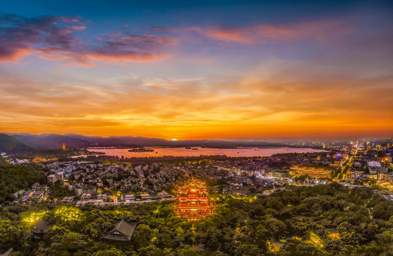 火紅的晚霞照耀著天邊,杭州城隍閣燈光亮起,散發著南宋時期的古風古韻。徐舜階攝