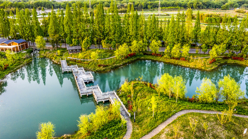 浙江仙居縣皤灘古鎮入口的濕地公園,藍天碧水、草木蔥翠。陳月明攝