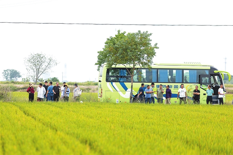9月26日,湖州市農業農村局農技人員帶領種糧大戶到稻田查看晚稻長勢,并指導他們進行稻田管護。眼下,晚稻陸續進入成熟期,豐收在望。 圖為農技人員和種糧大戶在湖州南潯區舊館街道查看晚稻長勢。(伊凡)
