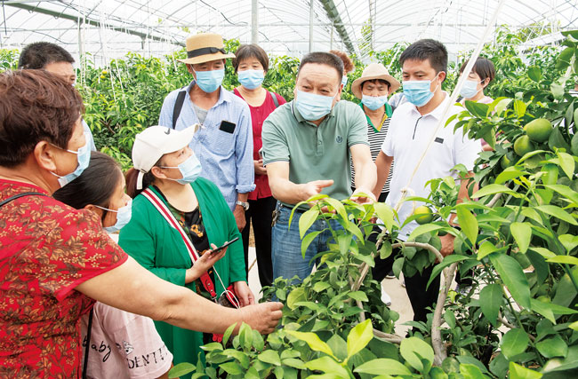 近日,在浙江某農業發展有限公司連棟大棚里,金華市農科院高級農藝師錢東南給果農們指導紅美人、葡萄柚等特色雜柑生態高效栽培技術。