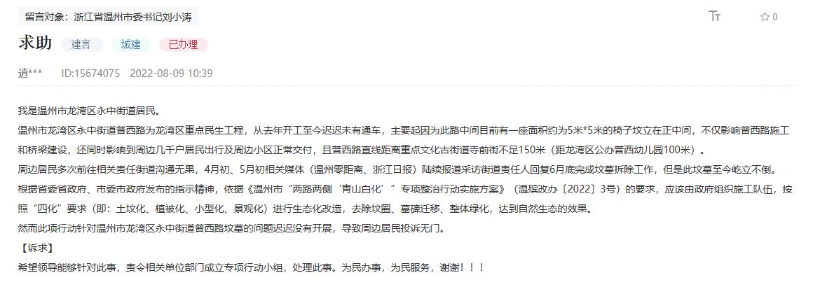 今年8月9日,溫州市龍灣區網友占先生在人民網“領導留言板”反映,正在修建的龍灣區永中街道普西路上有座私墳,附近居民曾多次溝通,但“此墳墓至今屹立不倒”。8月19日,龍灣區永中街道辦事處給出了明確回復,表示已簽訂相關協議,墳墓將于農歷8月底完成遷移。