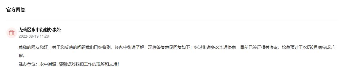 龍灣區永中街道辦事處副主任項小敏介紹,在“領導留言板”中回復的“已簽訂相關協議”屬實,在街道見證下,由龍灣區政府和墳主簽訂了遷墳協議,墳墓將于農歷8月底完成遷移。