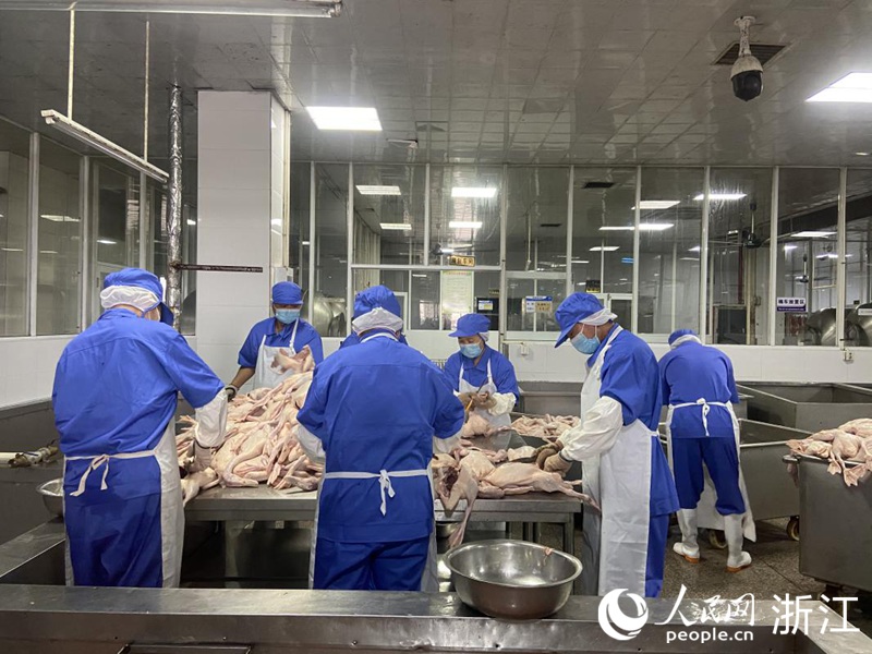 工作人員正在處理各類原料肉類食品。人民網 方彭依夢攝
