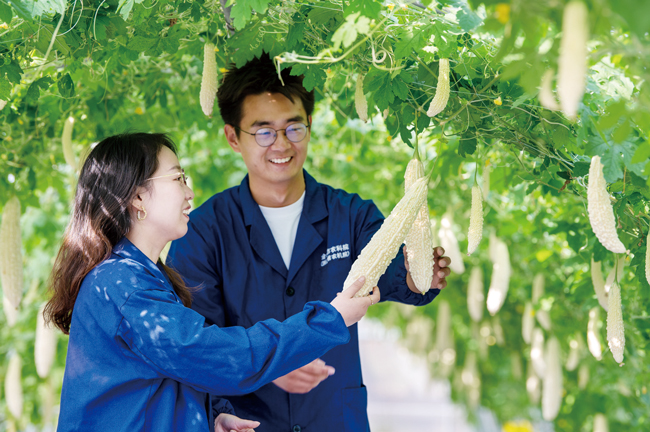 10月21日,金華市農科院科研基地里,培育的苦瓜新品種長勢喜人。 近年來,金華市農科院在農產品研發方面下功夫,專門成立設施蔬菜新品種研發中心,從品種選育、技術標準、基地建設提升、優質產品營銷運營等環節,助推優質農產品供給,帶動農民共同富裕。(胡肖飛)