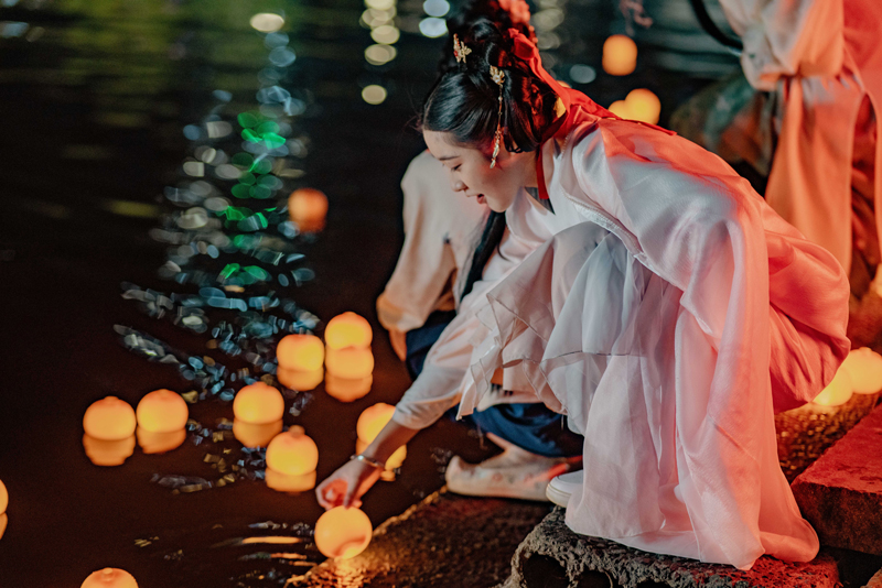 市民將橘燈放入西江河中。黃巖區傳媒集團供圖