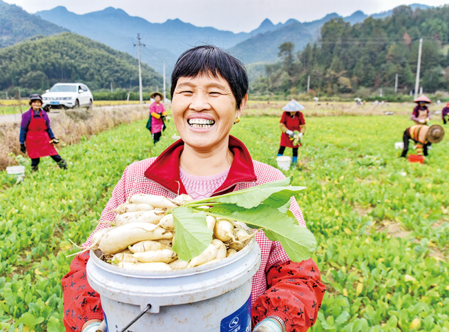 11月8日,金華市婺城區沙畈鄉高儒村蘿卜種植基地里人頭攢動,60多位村民正忙著把蘿卜采收、分揀、裝袋后,再由專車送到工廠進行深加工。高儒村位于白沙溪中上游,這里土地平整、陽光、水源充足。2021年,該村積極開展土地流轉,引進種植大戶,發展蘿卜種植產業。高儒村黨支部書記李永松介紹,該蘿卜基地占地600多畝,今年畝產1000多公斤,總產值近120萬元,村民們在家門口就能實現穩定增收。(吳潮宏)