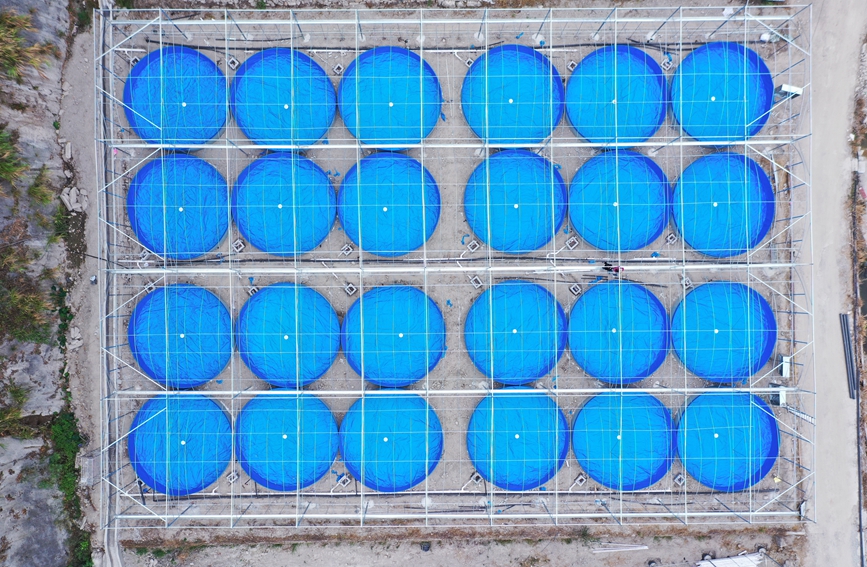 走進石斑魚養殖產業共富示范區建設項目現場,遠遠便能看到白色大棚。大棚內,幾名電工正忙碌著進行通電收尾工作。