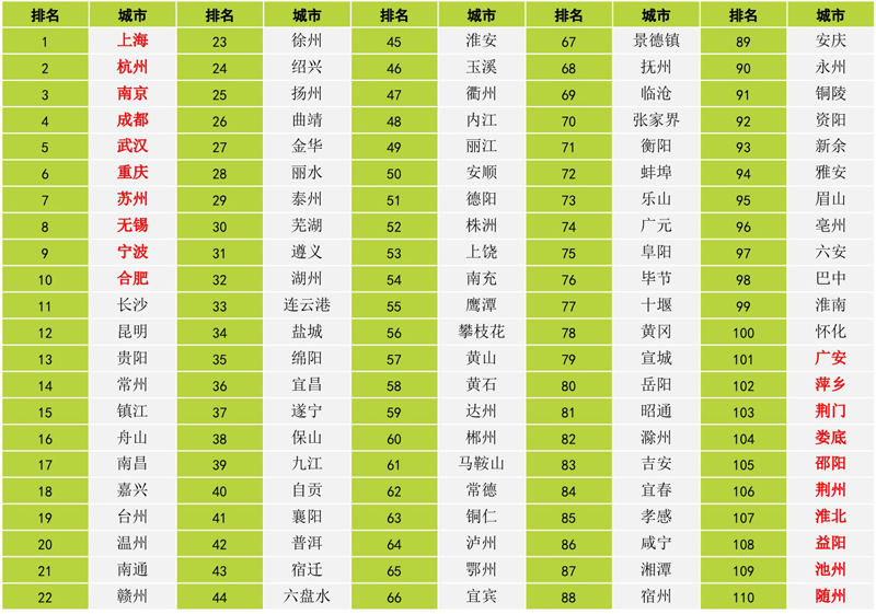 長江經濟帶城市協同發展能力指數(2022)表明,協同發展能力前十強城市依次為:上海、杭州、南京、成都、武漢、重慶、蘇州、無錫、寧波、合肥。無錫因生態支撐能力強勁進步三名。廣安、萍鄉、荊門、婁底、邵陽、荊州、淮北、益陽、池州、隨州則位列排行榜的后十名。