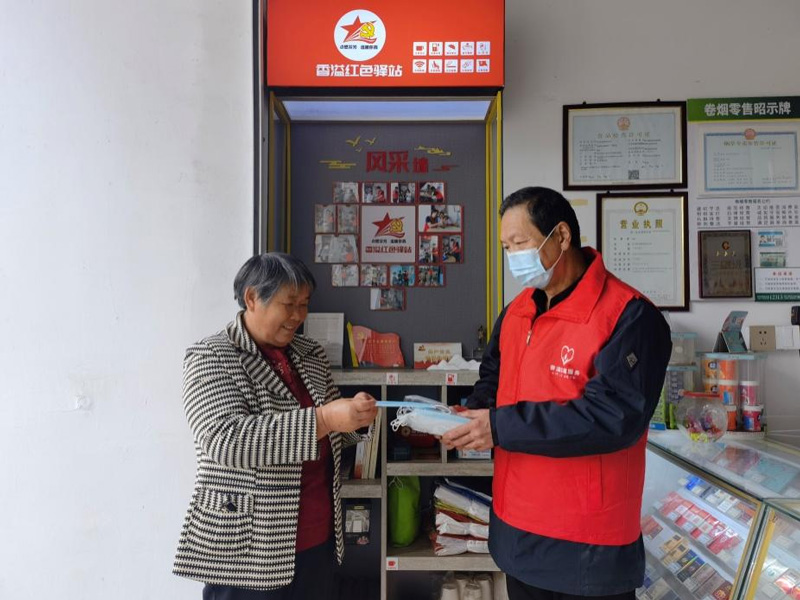 “香溢”志愿者為過往群眾遞上防疫口罩。臨安區煙草專賣局供圖