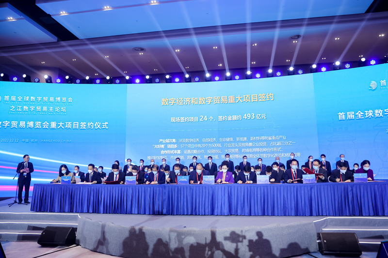 人民網杭州12月12日電 (記者郭揚)12日上午,以“聚焦數字貿易新發展 聚力數字經濟新未來”為主題的之江數字貿易主論壇在杭州舉辦,期間簽約了一批重大項目。據統計,現場共簽約項目24個,總投資額達493億元,項目涉及數字經濟、總部經濟、生命健康、新能源、新材料等浙江省重點產業。預計本屆數貿會期間全省場內外將簽約項目近90個,總投資超千億元。