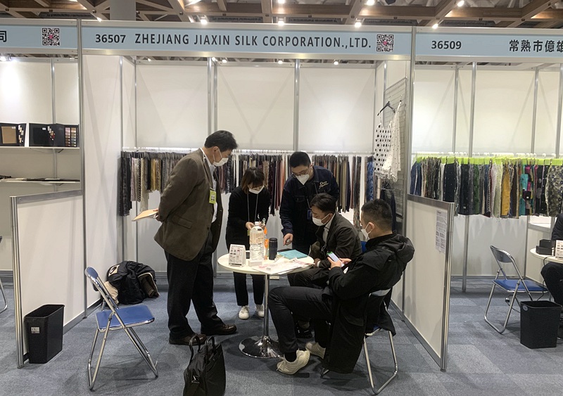 浙江嘉欣絲綢股份有限公司在AFF展會上的展位,右三是正在為日本客商介紹產品的陸晨輝。受訪者供圖