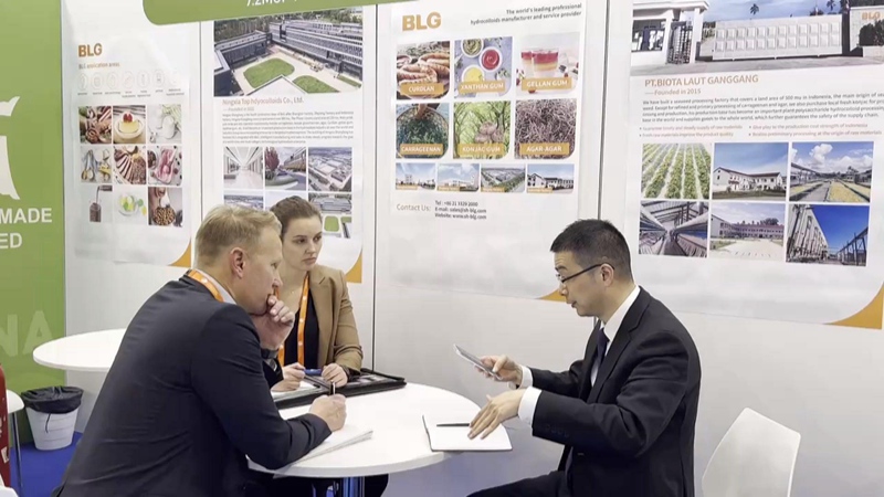 2022歐洲健康和天然食品配料展覽會上,客商來到展位咨詢。嘉興市商務局供圖