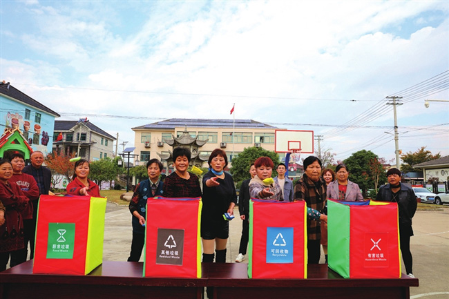湖州和平鎮長崗村黨員志愿者近日和村民們一起玩起了“丟沙包”游戲,先辨別“垃圾沙包”的類別,然后再扔到相應的垃圾桶里?;顒右杂螒驗槊浇?,讓垃圾分類的知識入腦走心,營造垃圾分類、人人有責的社會氛圍。(許旭)