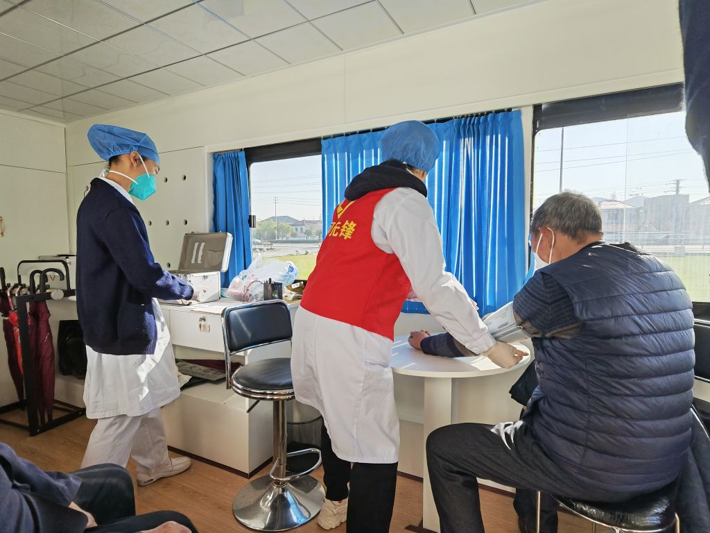 量體溫,測血壓,問病情……在印有“慈溪先鋒驛站橫河奮進號”字樣的大巴車內,設備一應俱全,一名醫生和一位護士正有序地為村民進行義診,并詳細地給出意見和建議。