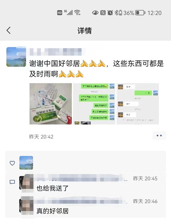 “誰家有美林,孩子發燒了”“我家還有”“抗原試劑盒誰要”“藥給你掛門口了”……面對“江湖救急”,居民們紛紛“慷慨解囊”,體溫計、消毒液、藥品等經過交換提供給了急需的居民?!?號樓一位業主葉女士自費在省外買了1萬多元的藥品給員工,看到小區業主群里有業主說缺藥,就主動聯系缺藥的鄰居免費送去退熱藥品和抗原檢測試劑?!便y安社區黨總支書記兼居委會主任潘丹虹說。