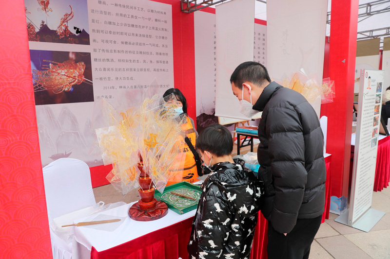 “畫一條龍”“我要小兔子”“我要小豬佩奇”……糖塑糖畫的展位前,擠滿了等待糖畫的小朋友們,糖畫師傅湯建妙笑呵呵地回應著孩子們,手上的功夫卻是半刻不停。只見他舀出一勺糖汁,手腕微微傾斜,隨著糖汁落下,湯師傅游刃有余地在鋼板上作畫,不消片刻,一件精美的糖畫作品便躍然板上。生肖動物、卡通人物,湯師傅總能繪制得惟妙惟肖。孩子們手握著糖畫,舍不得入口。