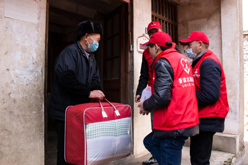 “香溢”志愿服務隊隊長張根燦了解到還有更多山區留守老人與孩子需要幫助后,在志愿群號召更多人參與到送溫暖活動中,組織志愿隊購買棉被、熱水袋、棉手套等過冬物資以及口罩、消毒液等防疫用品,打包成一個個“健康愛心包”,及時送到浦江縣中余鄉、大畈鄉、檀溪鎮等偏遠地區的10位孤寡老人家中,同時協同鄉鎮社工站深入開展“公益學堂”,做好留守兒童假日輔導等服務。