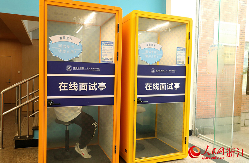 杭電自動化學院黨委副書記吳漢玲告訴人民網,近幾年,畢業生找工作和研究生面試幾乎都從線下轉到了線上,隨著參加線上面試的同學越來越多,想要在校園內找一個安靜的環境參加面試并不容易。因此,學院專門花心思打造了“線上面試亭”,以解學生燃眉之急。