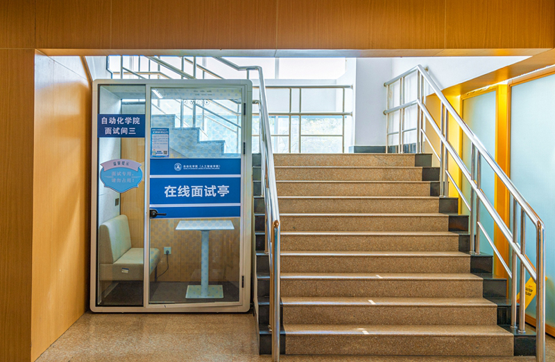 在第二教學樓一樓大廳的樓梯附近,有3個電話亭樣式的小隔間,這便是“線上面試亭”。面試亭內,幾位學生正端坐在電腦屏幕前接受線上面試?!熬€上面試亭”約3平方米,拉開面試亭的門,燈光柔和的感應燈隨即亮起。亭內設有椅子、插座,以及可以放置電子設備的隔板,環境舒適清爽。此外,面試亭的玻璃外層還裝有隔音層。